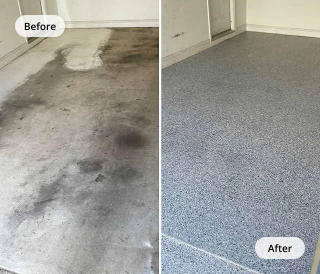 Our flake flooring transformations turn worn, stained surfaces into durable, eye-catching floors built to last. With precise preparation and professional installation, we have delivered seamless finishes that resist moisture, chemicals, and heavy traffic, creating a clean, modern look that elevates any space. Have a glimpse at the before-and-after results!